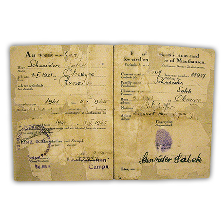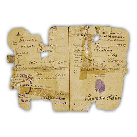 Extremely fragile and damaged, this Holocaust identification card required stabilizing and strengthening to preserve it for posterity. These repairs were achieved by filling the paper losses with toned Japanese tissue. Because the soluble inks on the document precluded any wet treatment, tape, dirt, and staining were removed through dry cleaning processes.