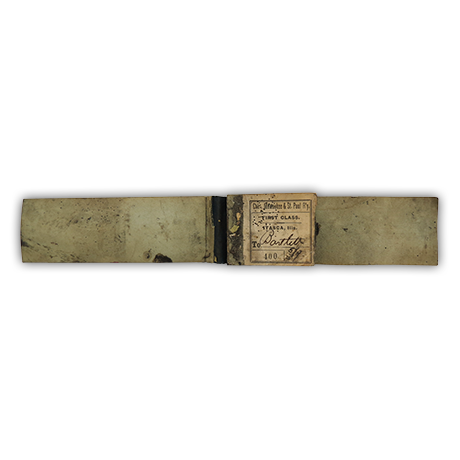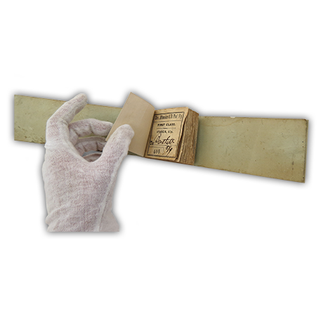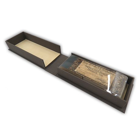 This booklet arrived in our lab extremely dirty and sooty, with part of its back cover broken off. Our conservators cleaned the booklet and the ticket stubs inside, as well as filled the losses in the back cover with antique board and paper. After reinforcing the fraying cloth on the spine, they housed the booklet in a custom-made, protective drop spine box.