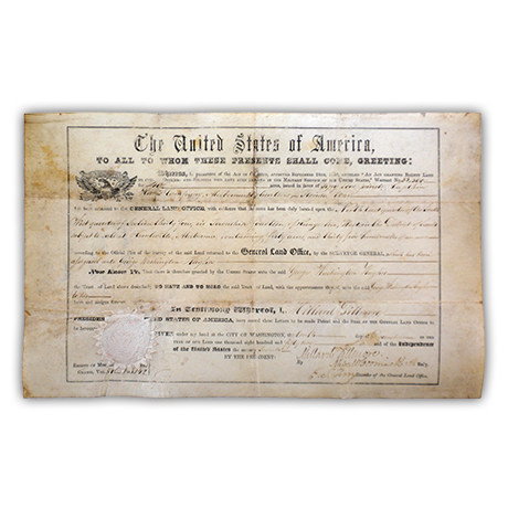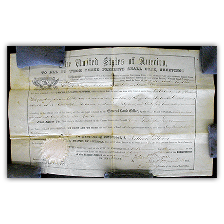 This federal land grant from 1852 was made on vellum. It had developed several hard creases from being folded over the years. Worn and torn along the creases, the document also had multiple blotchy stains. To flatten it and treat the inks on the surface, our conservators humidified the document. Cleaning and tear repair were also important parts of this item’s treatment.