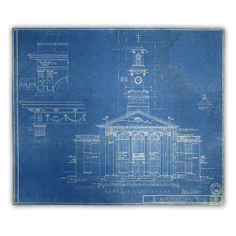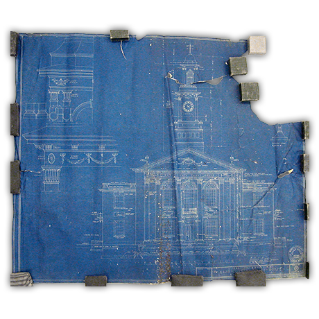 Buried under heavy layers of dirt and insect debris, this blueprint required a thorough cleaning using multiple methods. In addition to being dry cleaned and washed in filtered water, this blueprint was treated with an alcohol solution to neutralize the possibility of further insect damage. Tears and wrinkles were then fixed and the large section of paper that had torn off was filled with matching blueprint paper provided by the client.