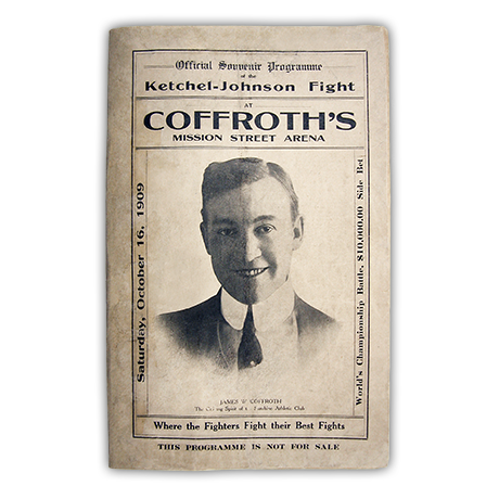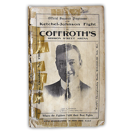 This boxing programme from 1909 was extremely torn, dog-eared, and falling apart at the spine. Improperly repaired with tape, the booklet was marred with adhesive stains and a central crease. To clean and treat this piece, our conservators removed the tape and dismantled the booklet. After fixing the tears, flattening the crease, and inpainting the areas of ink that had worn off, our conservators reassembled the restored programme.