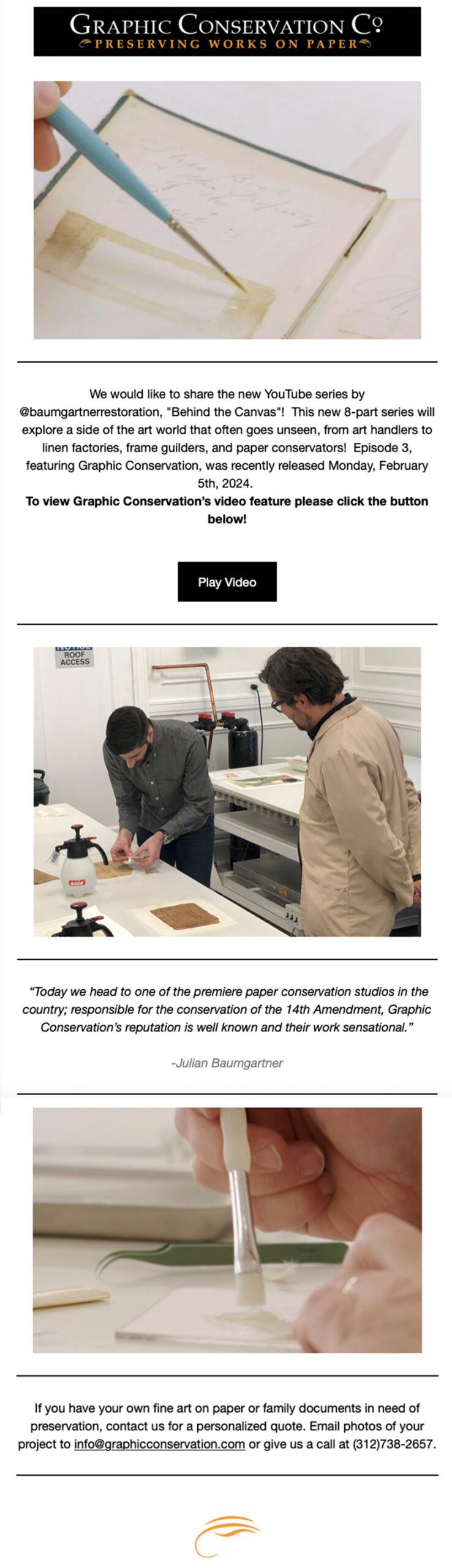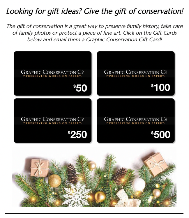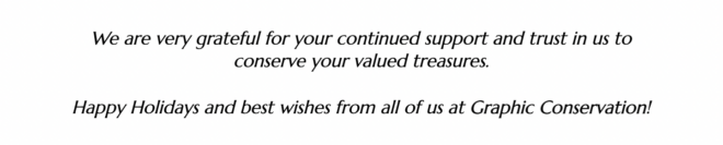 Graphic Conservation was temporarily closed due to the Covid-19 pandemic. All current client items have been safely stored and are currently being reassessed for treatment deadlines. We are accepting new items for evaluation; please call us at (312) 738 – 2657 or email info@graphicconservation.com for any new inquiry.